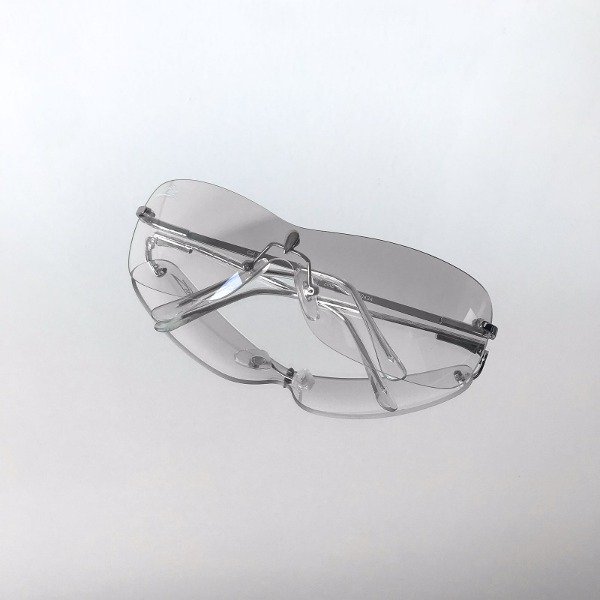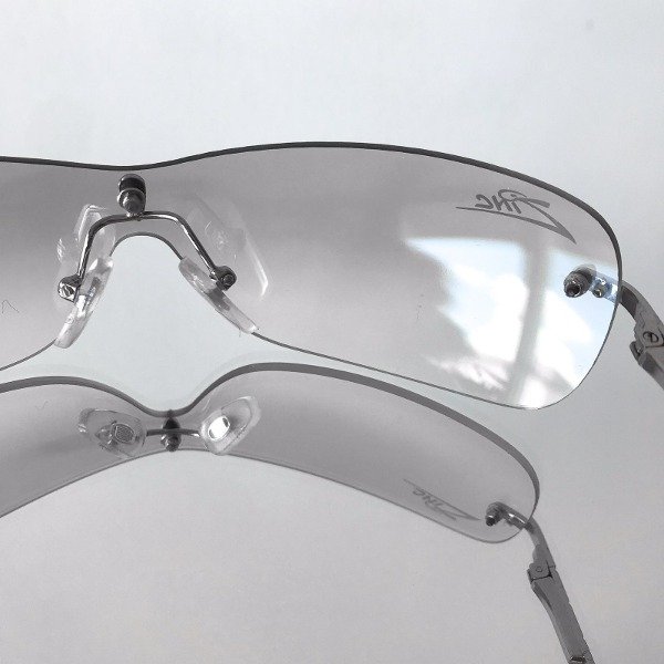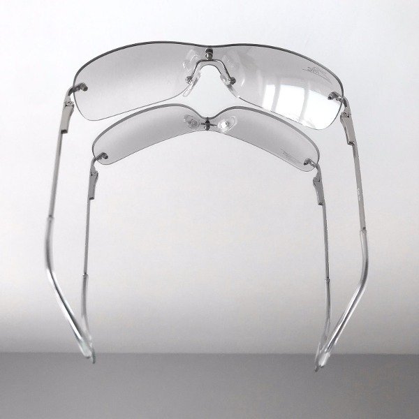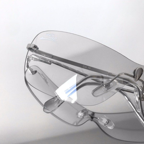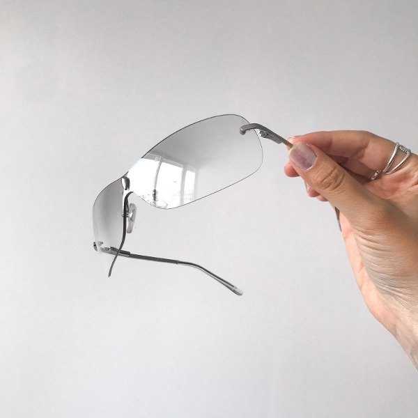 Lentes con cristal transparente espejado montado al aire (sin marco), patillas y detalles en plateado. estilo envolvente.