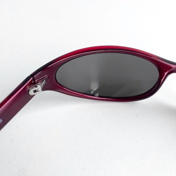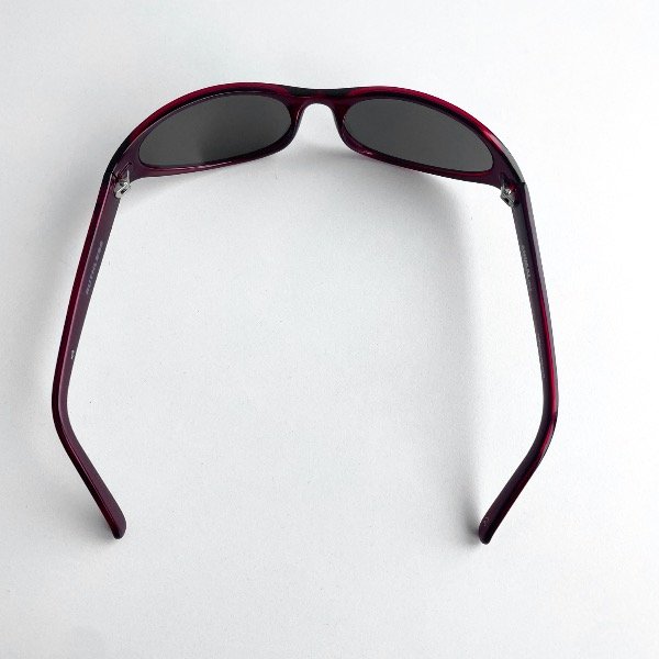 Lentes con marco rojo y cristal negro, detalle blanco en patillas. Estilo envolvente.