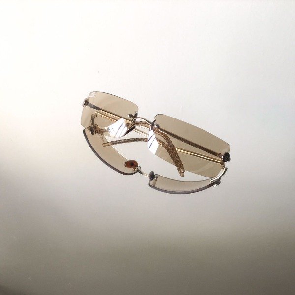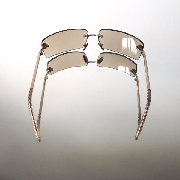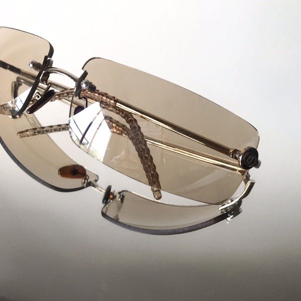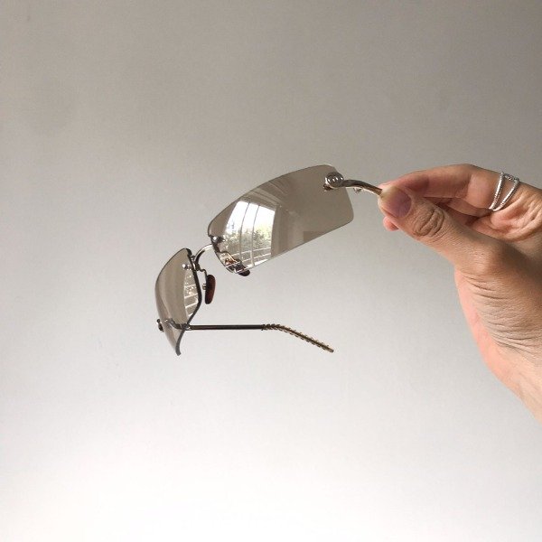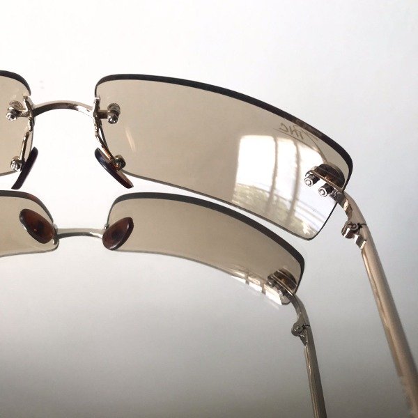 Lentes con cristal marrón claro espejado montado al aire (sin marco), patillas y detalles en dorado.