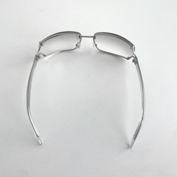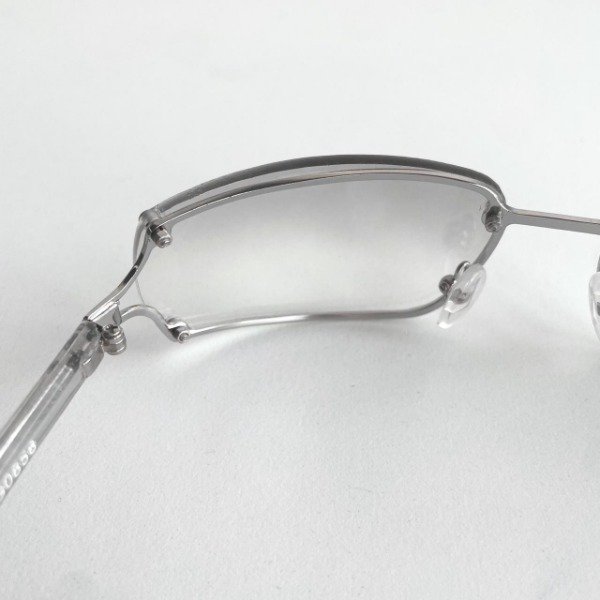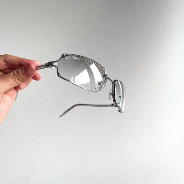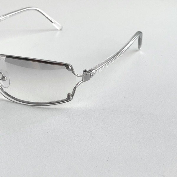 Lentes con cristal transparente espejado y marco plateado, estilo envolvente.